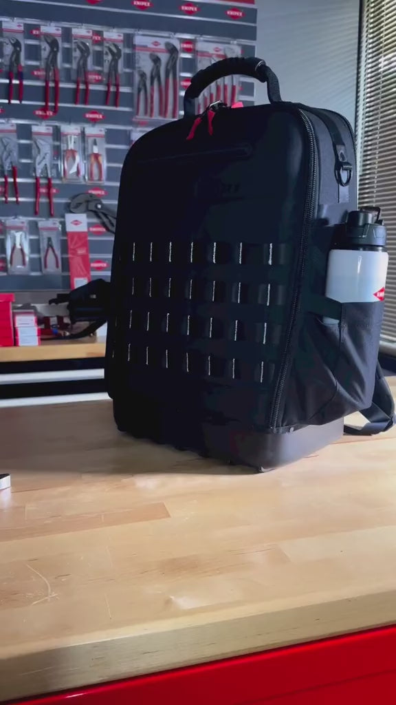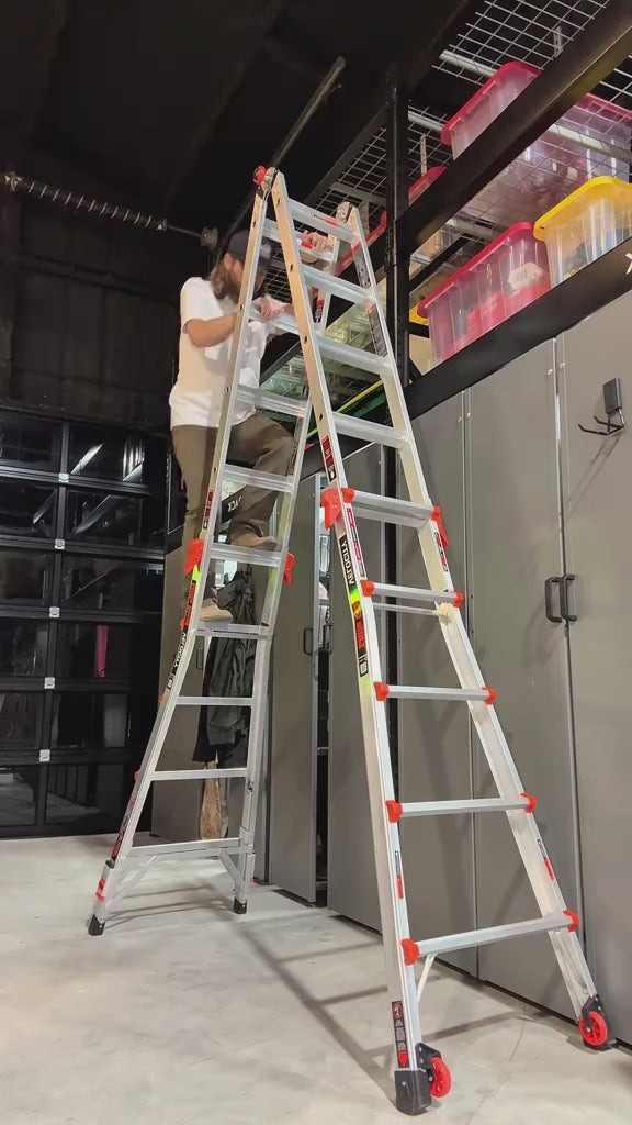 Lightweight, multi-functional, foldable aluminum telescopic ladder with two triangular stabilizers; maximum load capacity 330 lbs.