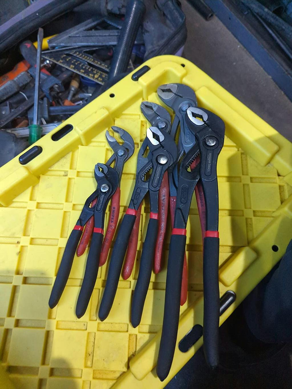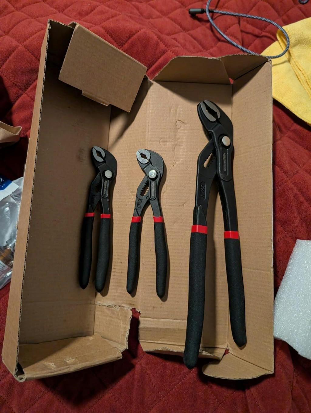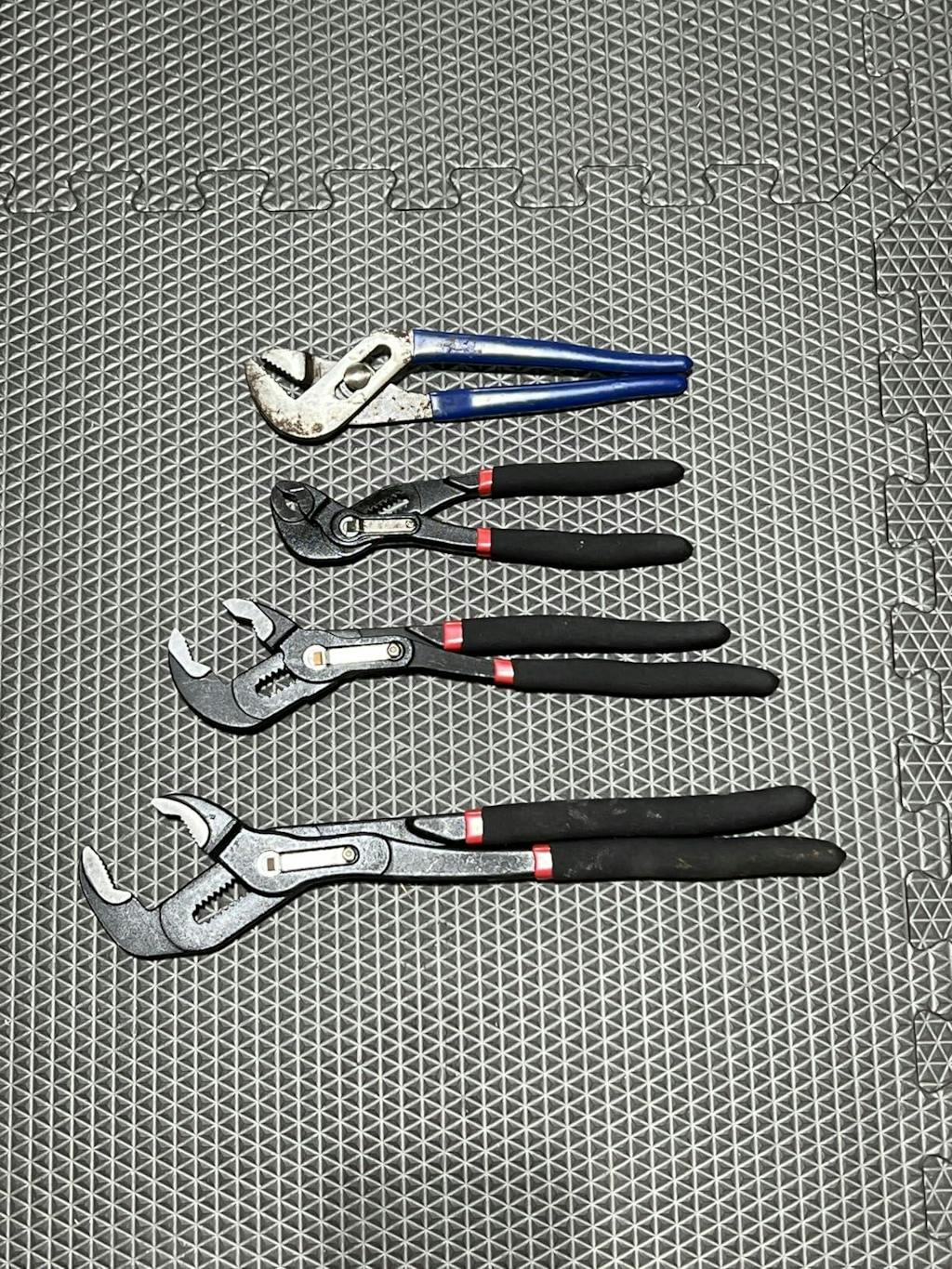 • 3-piece set of quick-release groove joint pliers for loosening nuts, gripping pipes, tightening fasteners, and more